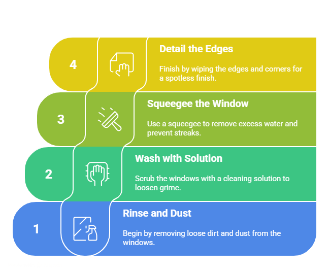 - Rinse and dust: Start by removing loose dirt. Use a garden hose or spray from your pole to wet the windows and loosen dust. If you have access from inside, vacuum or wipe away cobwebs and dirt on the frames first. (Always rinse before scrubbing to avoid grinding grit into the glass.)